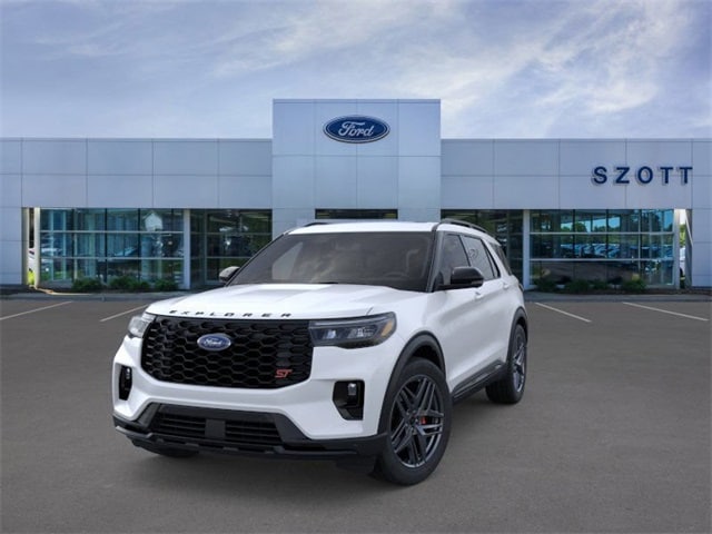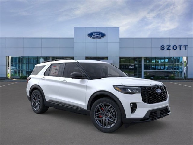 Recent Arrival! 4WD, ABS brakes, Active Cruise Control, Alloy wheels, Compass, Electronic Stability Control, Front dual zone A/C, Heated door mirrors, Heated front seats, Heated rear seats, Illuminated entry, Low tire pressure warning, Navigation System, Power Liftgate, Remote keyless entry, Traction control. 2026 Ford Explorer ST 4WD 3.0L EcoBoost V6 Star White Metallic Tri-Coat