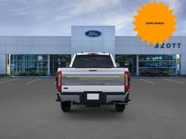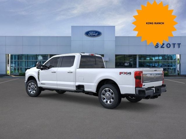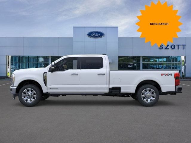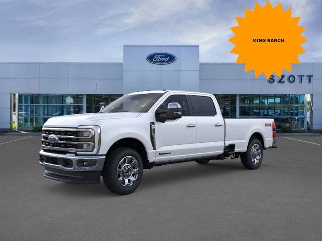 With some available options like 5th Wheel/Gooseneck Hitch Prep Package, Chrome Package, Ford Connectivity Package (1-Year Included), Ford Connectivity Package (one-Time Purchase - 7 Years), FX4 Off-Road Package (Hill Descent Control, Off-Road Specifically Tuned Shock Absorbers, and Unique FX4 Off-Road Box Decal), Internet access capable: 5G Modem - Ford Connectivity Package, Order Code 710A (Flow-Through Console, Radio: B&O Unleashed Sound System by Bang & Olufsen, SiriusXM with 360L, SYNC 4 with Enhanced Voice Recognition, Unique King Ranch Leather 40/Console/40 Seats, and Wheels: 20" Bright Machined Aluminum), 4WD, 14 Speakers, 4-Wheel Disc Brakes, ABS brakes, Adjustable pedals, Air Conditioning, Alloy wheels, AM/FM radio: SiriusXM with 360L, Auto High-beam Headlights, Auto tilt-away steering wheel, Auto-dimming Rear-View mirror, Automatic temperature control, Brake assist, Compass, Delay-off headlights, Driver door bin, Driver vanity mirror, Dual front impact airbags, Dual front side impact airbags, Electronic Stability Control, Emergency communication system: SYNC 4 911 Assist, Front anti-roll bar, Front Bucket Seats, Front Center Armrest, Front dual zone A/C, Front fog lights, Front reading lights, Fully automatic headlights, Garage door transmitter, Heads-Up Display, Heated door mirrors, Heated front seats, Heated rear seats, Heated steering wheel, Illuminated entry, Leather steering wheel, LED Roof Clearance Lights, Low tire pressure warning, Memory seat, Navigation system: Connected Navigation, Outside temperature display, Overhead airbag, Overhead console, Panic alarm, Passenger door bin, Passenger vanity mirror, Pedal memory, Power door mirrors, Power driver seat, Power passenger seat, Power steering, Power windows, Pro Power Onboard - 2kW, Rain sensing wipers, Rear reading lights, Rear seat center armrest, Rear step bumper, Rear window defroster, Remote keyless entry, SecuriCode Keyless Entry Keypad (driver's Side), Security system, Speed control, Split folding rear seat, Steering wheel memory, Steering wheel mounted A/C controls, Steering wheel mounted audio controls, Tachometer, Telescoping steering wheel, Tilt steering wheel, Tough Bed Spray-in Bedliner, Traction control, Trip computer, Turn signal indicator mirrors, Twin Panel Power Moonroof, Upfitter Switches (6), Variably intermittent wipers, and Ventilated front seats Prices may not included Dealer added accessories.
